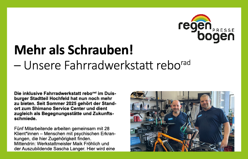 Unsere Regenbogenpresse ist sowohl digital als auch per Briefpost wieder auf dem Weg zu ihren Leser*innen. Auf sechs gestalteten Seiten erwarten Sie frische Nachrichten aus dem Regenbogen: Der neu gewählte Vorstandsvorsitzende wird vorgestellt, es gibt Neuigkeiten aus unserer inklusiven Fahrradwerkstatt und Highlights aus unserer bunten Gemeinschaft.